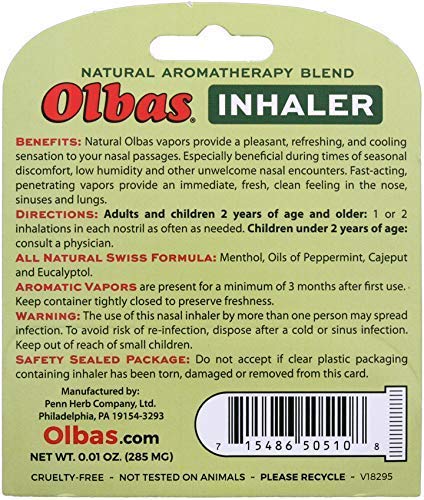 Details: The powerful, Swiss-derived formula in the Olbas Aromatherapy Inhaler provides powerful vapors that revitalize breathing passages with just a few deep breaths. An excellent, natural approach to nasal care throughout the year, this invigorating formula delivers a refreshing sensation to help you get through seasonal discomforts with ease. The all-natural formula is fast-acting and non-habit forming, so you can enjoy a fresh, clean feeling in the nose as needed.