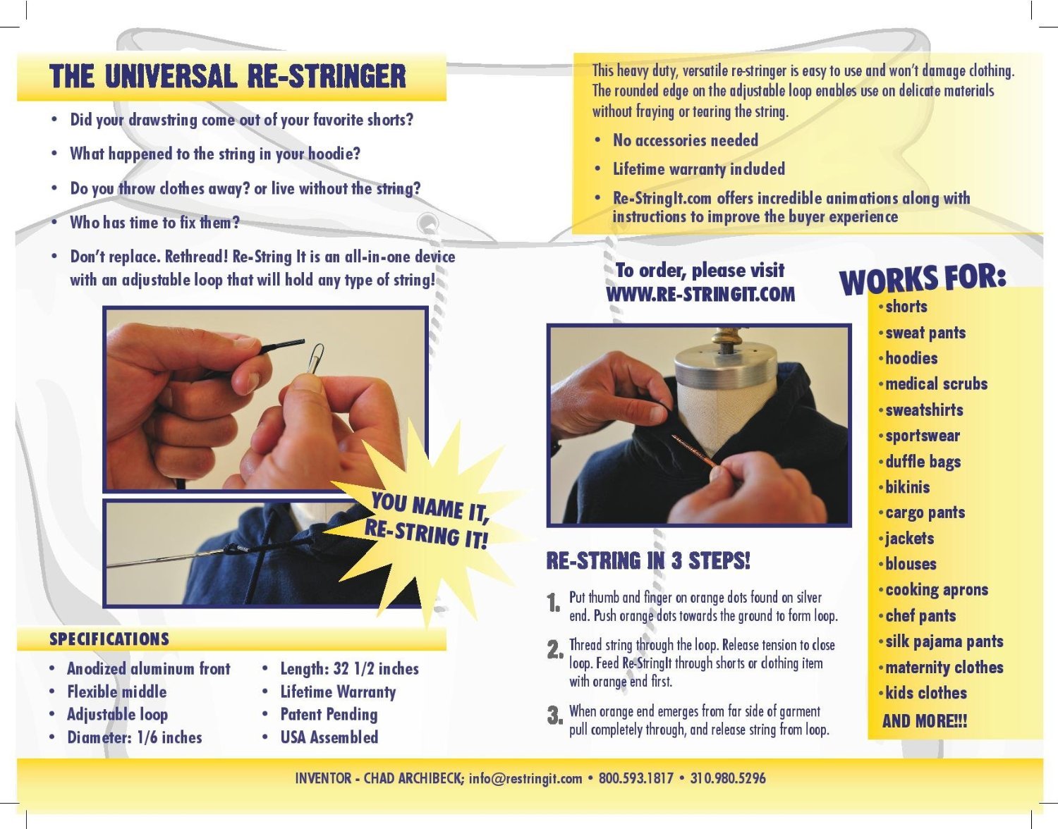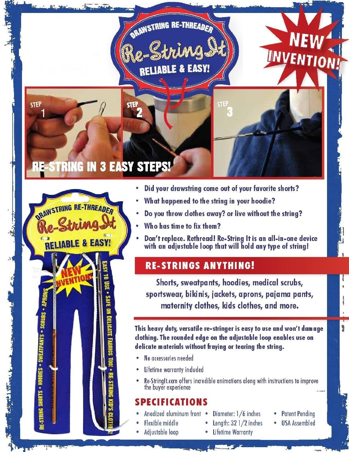 Details: Introducing the world’s first Universal Drawstring Re-Threader Re-StringIt is an all in one re-threader designed to re-thread much more than just hoodies and sweat pants. Re-StringIt can also re-thread cooking aprons, kid's clothes, maternity clothes, pajamas, medical scrubs, outdoor equipment and more. Anything with a string, Re-StringIt. Re-StringIt eliminates the hassle of using a safety pin and will re-thread anything in seconds. No Hassle Re-StringIt is a mechanical device that has been built to last. The metal pieces are anodized, and the cable is protected by thin plastic layer. There are so many different things that can be re-thread, and with the rigid front, flexible middle, and adjustable loop in the back, Re-stringIt is always up to the challenge. It's that easy. Time and clothing is too valuable to throw away! Re-StringIt is a perfect substitute to the conventional time consuming methods: the safety pin and coat hanger. The safety pin takes far too long, and these days time is valuable, and a coat hanger will destroy the inside of the clothing. With the adjustable loop, the diameter of the device is never compromised, and the rigid front allows passageway through the clothing without bringing the guts of the clothing out with it. Great for Halloween costume fix, amazing Christmas gift ,or stocking stuffer For any Mom Or Dad !!!!!